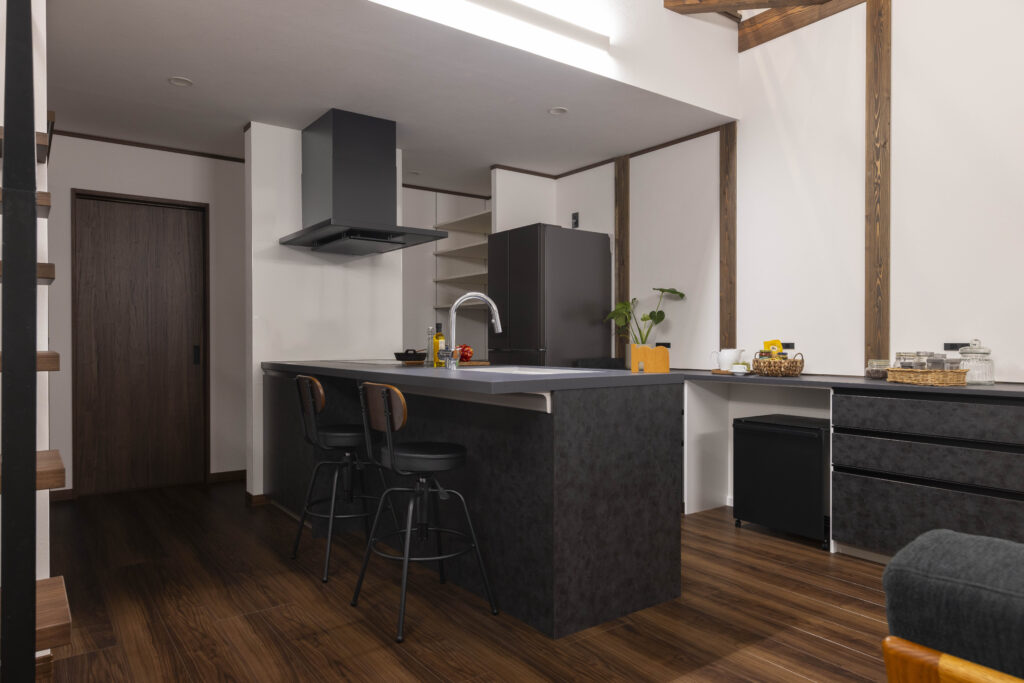 落ち着いたグレーのカウンターと六角タイルが、上質で静かな雰囲気に。