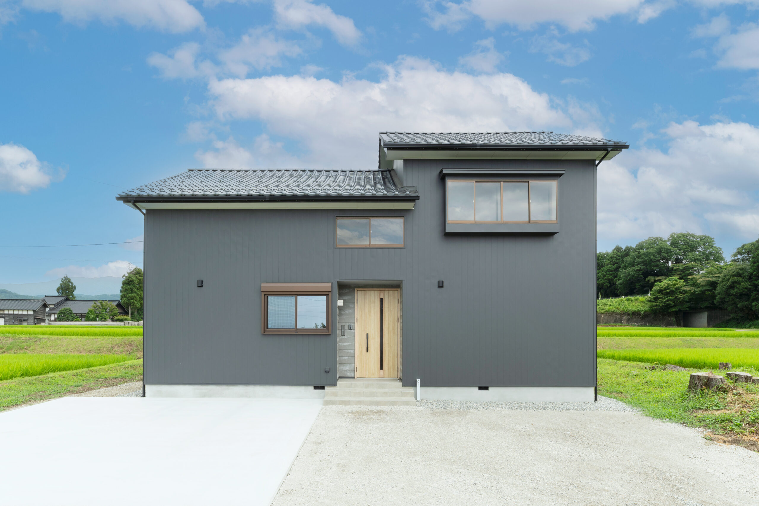 深みのあるダークグレーの外壁と木製ドアのコントラストが目を引く、