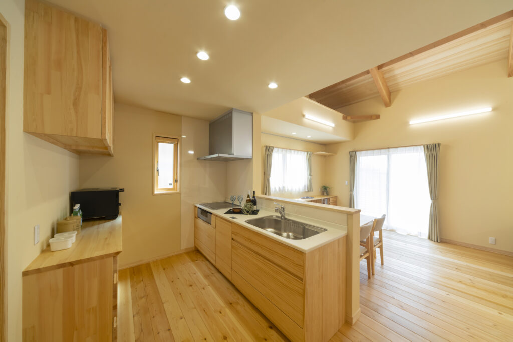 無機質になりがちなシステムキッチンやカップボードも、ナチュラルな木にすることにより、統一感のあるやさしい空間に。
