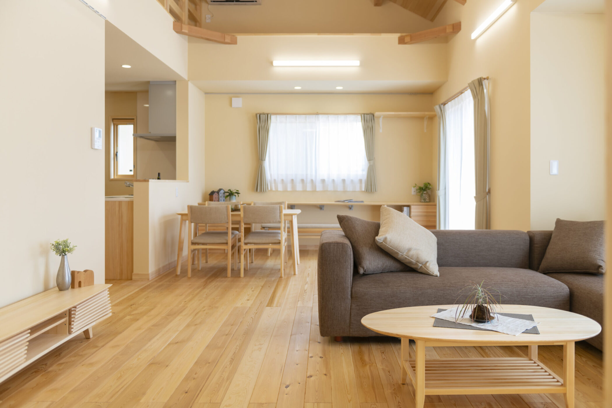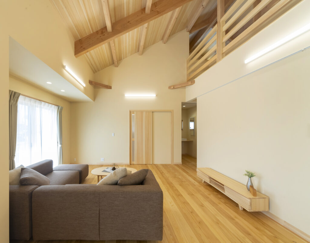 扉を開けると広がる大空間。天然木の香りと温もりを感じる住まいです。