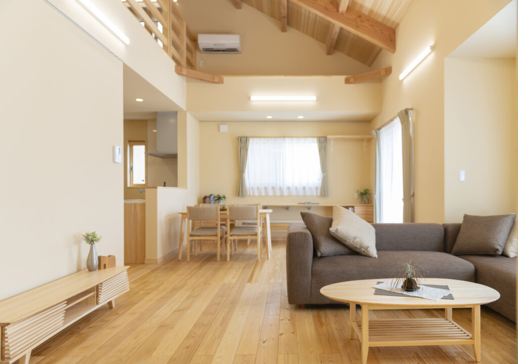 解放感のあるリビング・ダイニング。エアコン1台で快適に過ごせます。